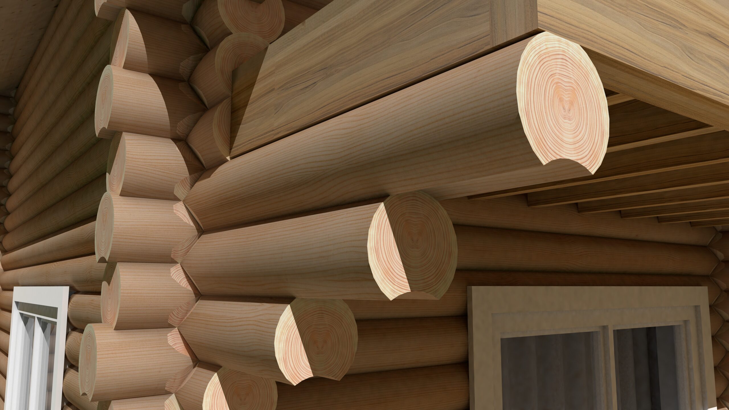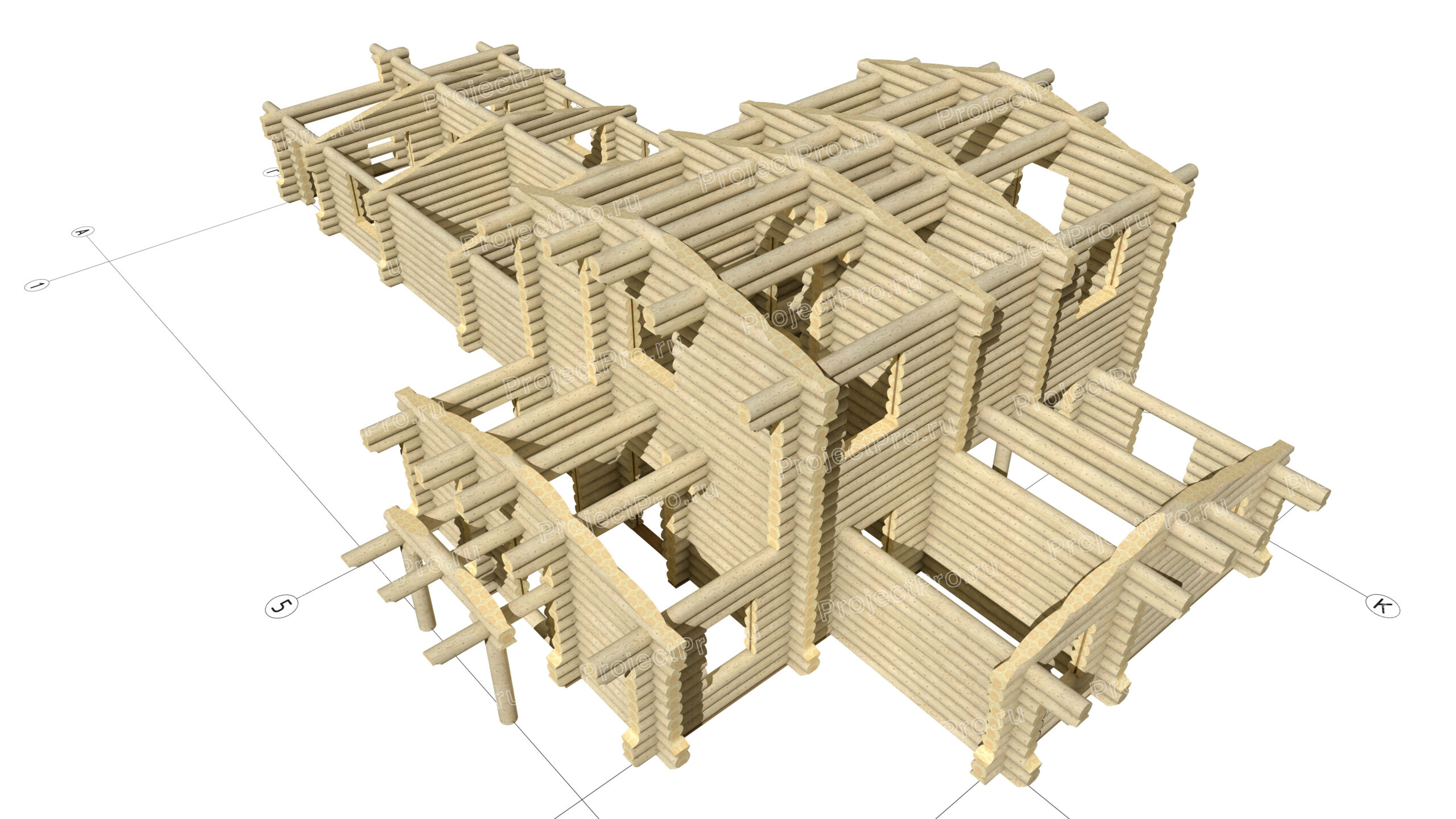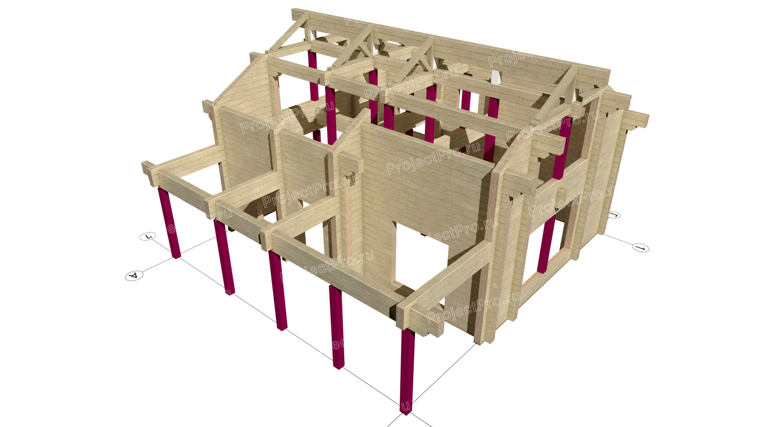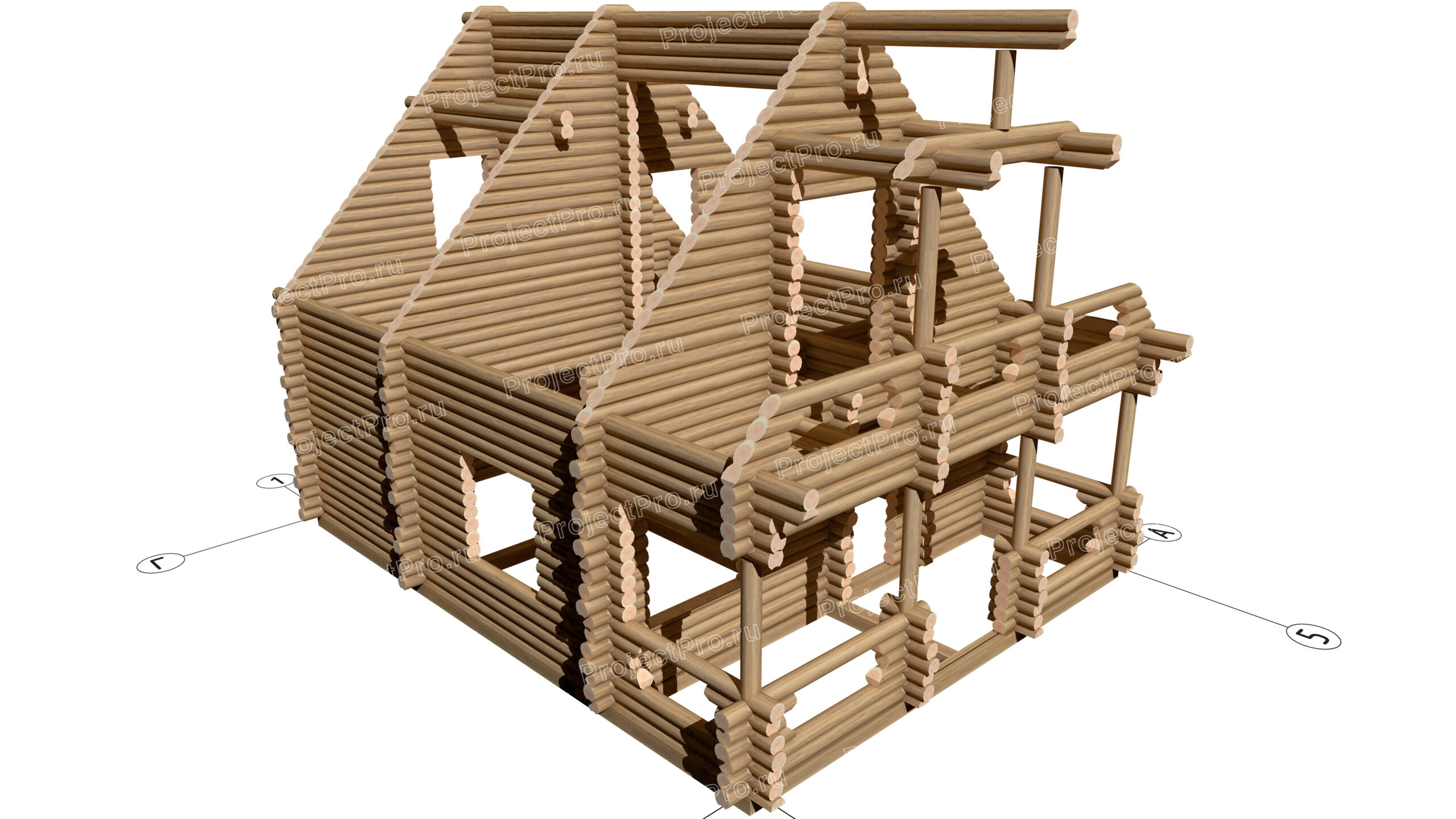 3D виды сруба, элементов силового каркаса, опоры, элементов деревянных конструкций