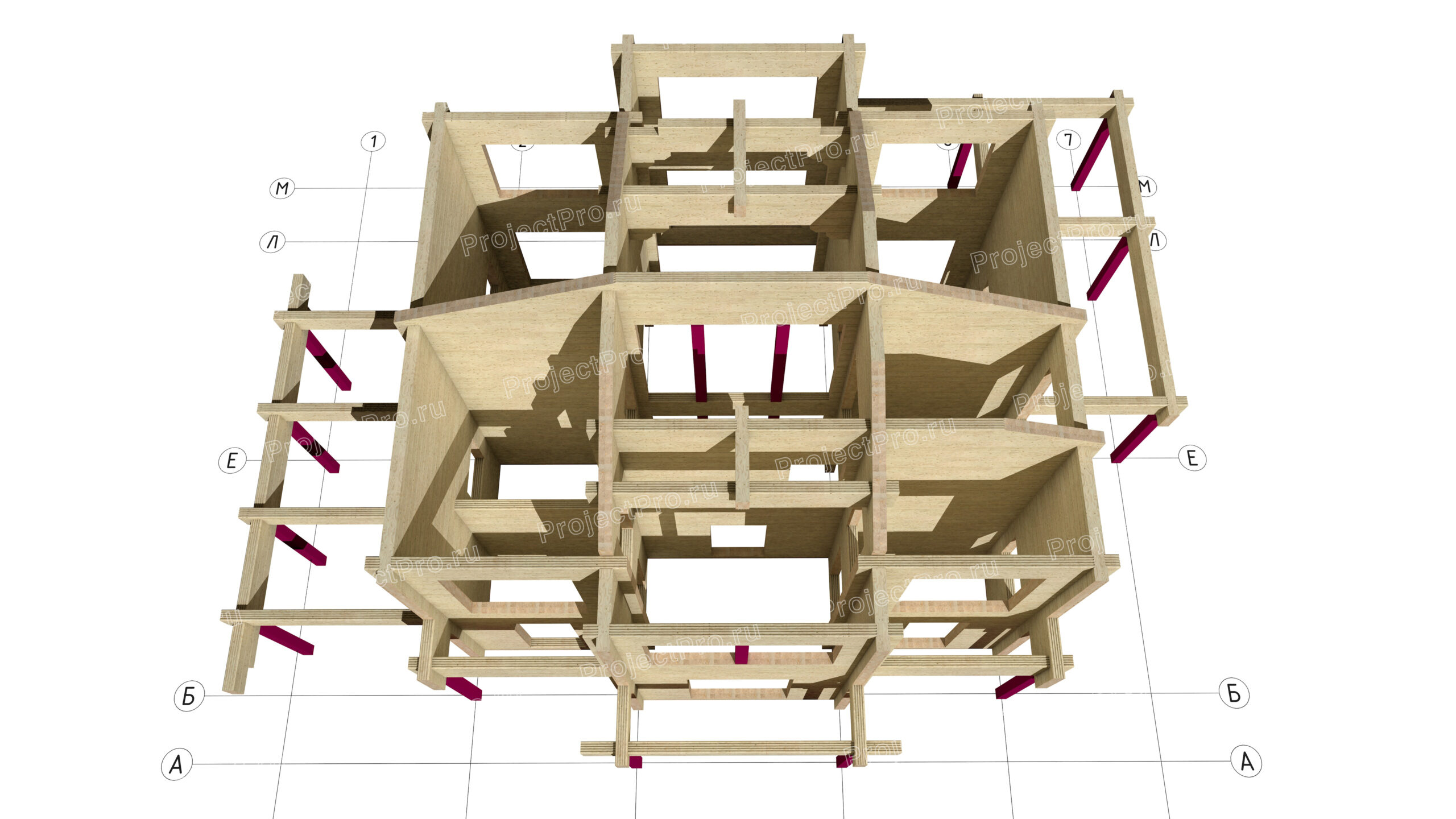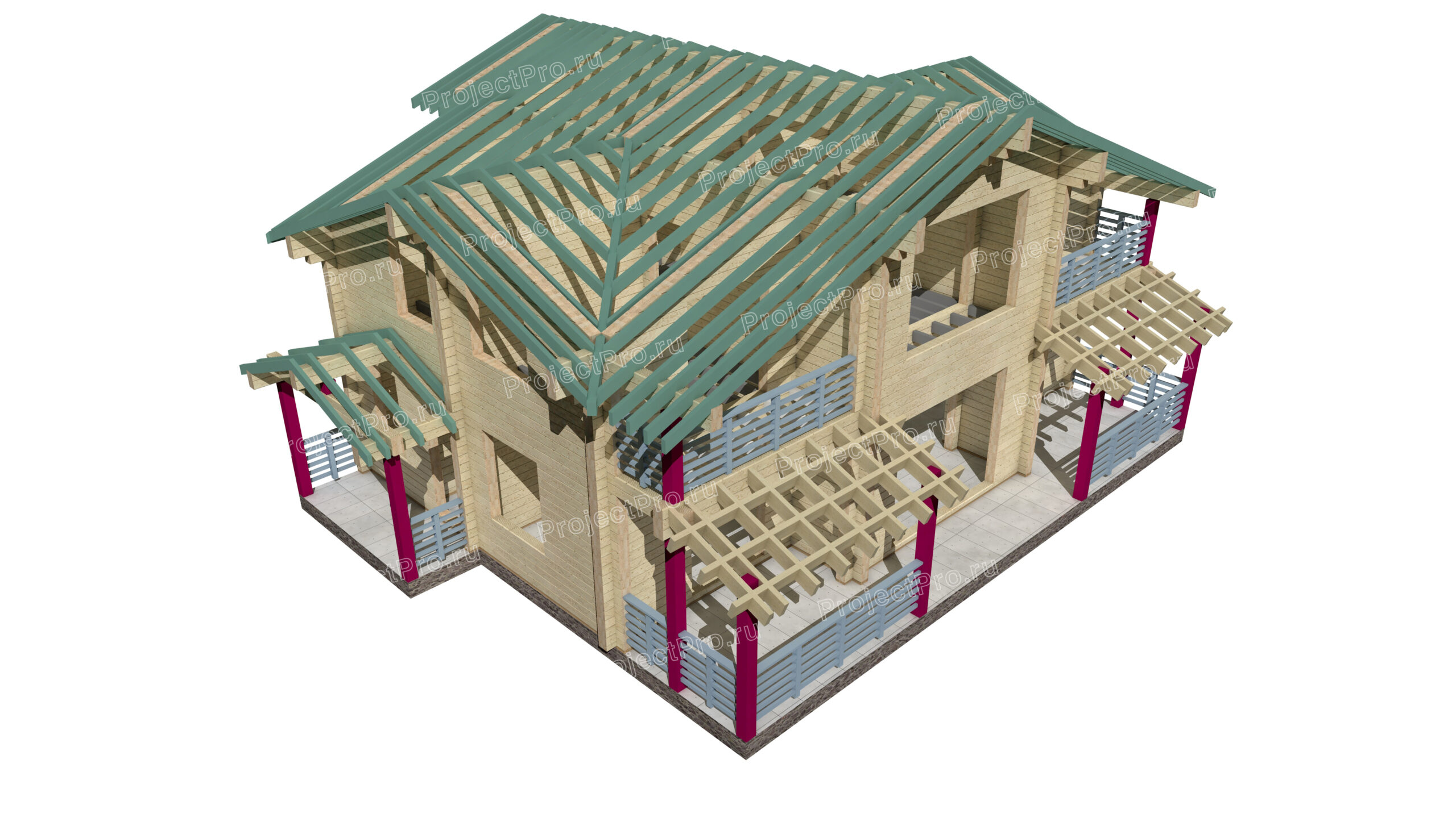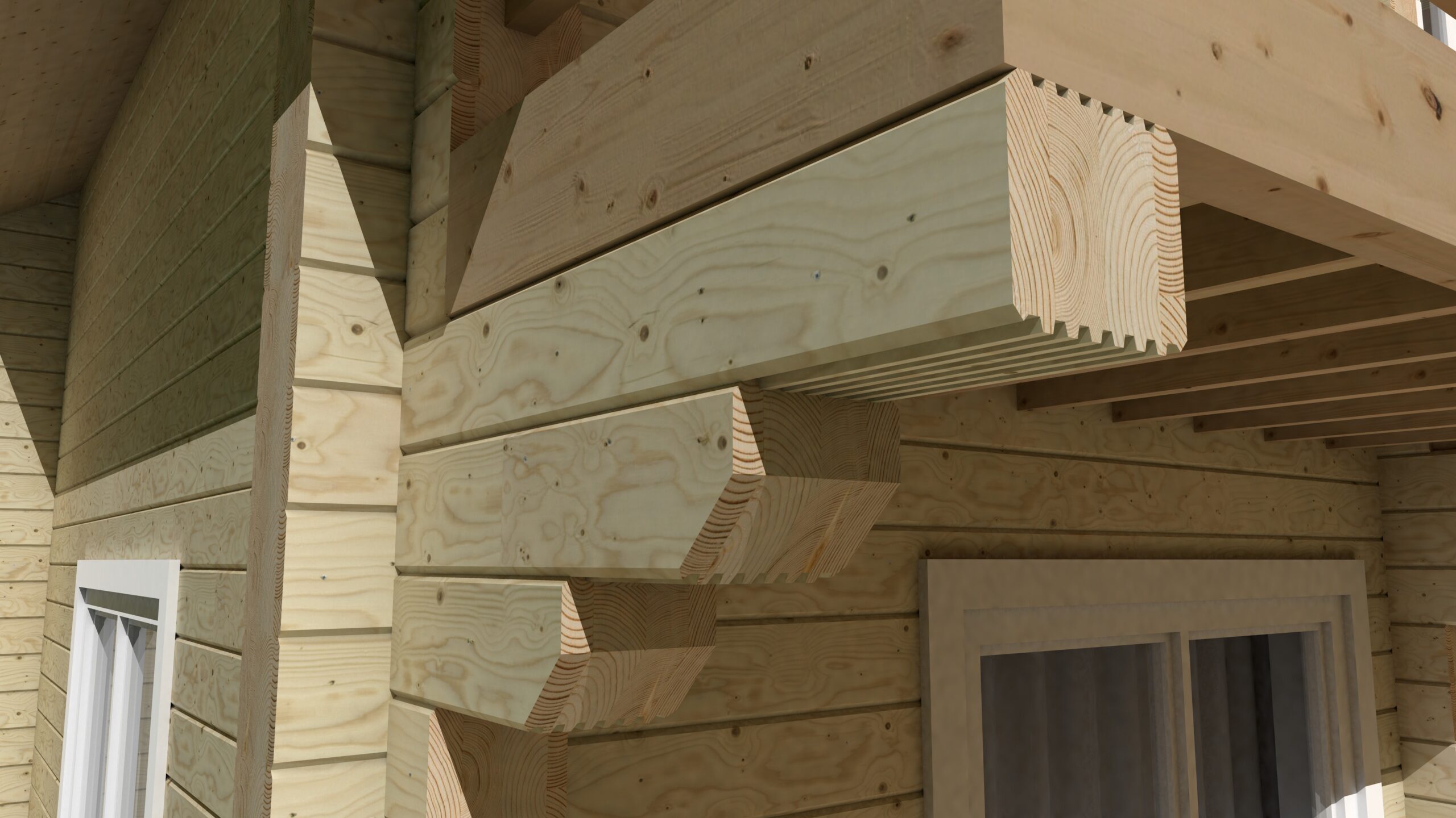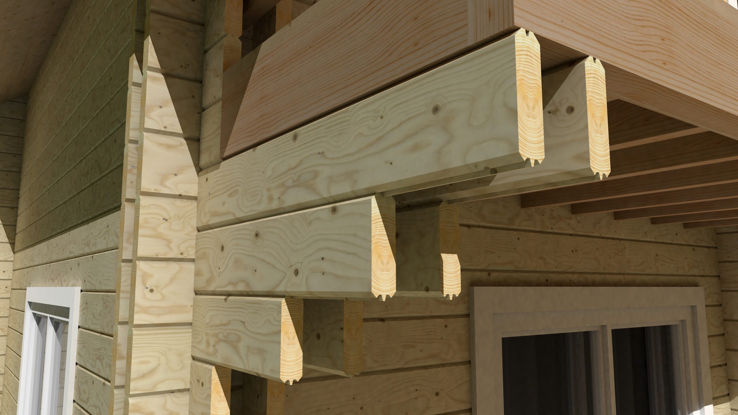 3D виды сруба, элементов силового каркаса, опоры, элементов деревянных конструкций